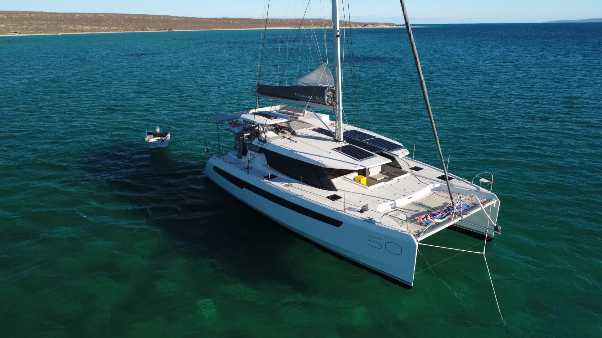 Custom-built Leopard 50 performance catamaran, 15.4 metres. 4 air-conditioned queen staterooms with private ensuites and individual entertainment systems. Indoor saloon, alfresco decks, and rooftop lounge with 360-degree views. Cruising speed of 12 knots, wind-powered with twin engine backup.