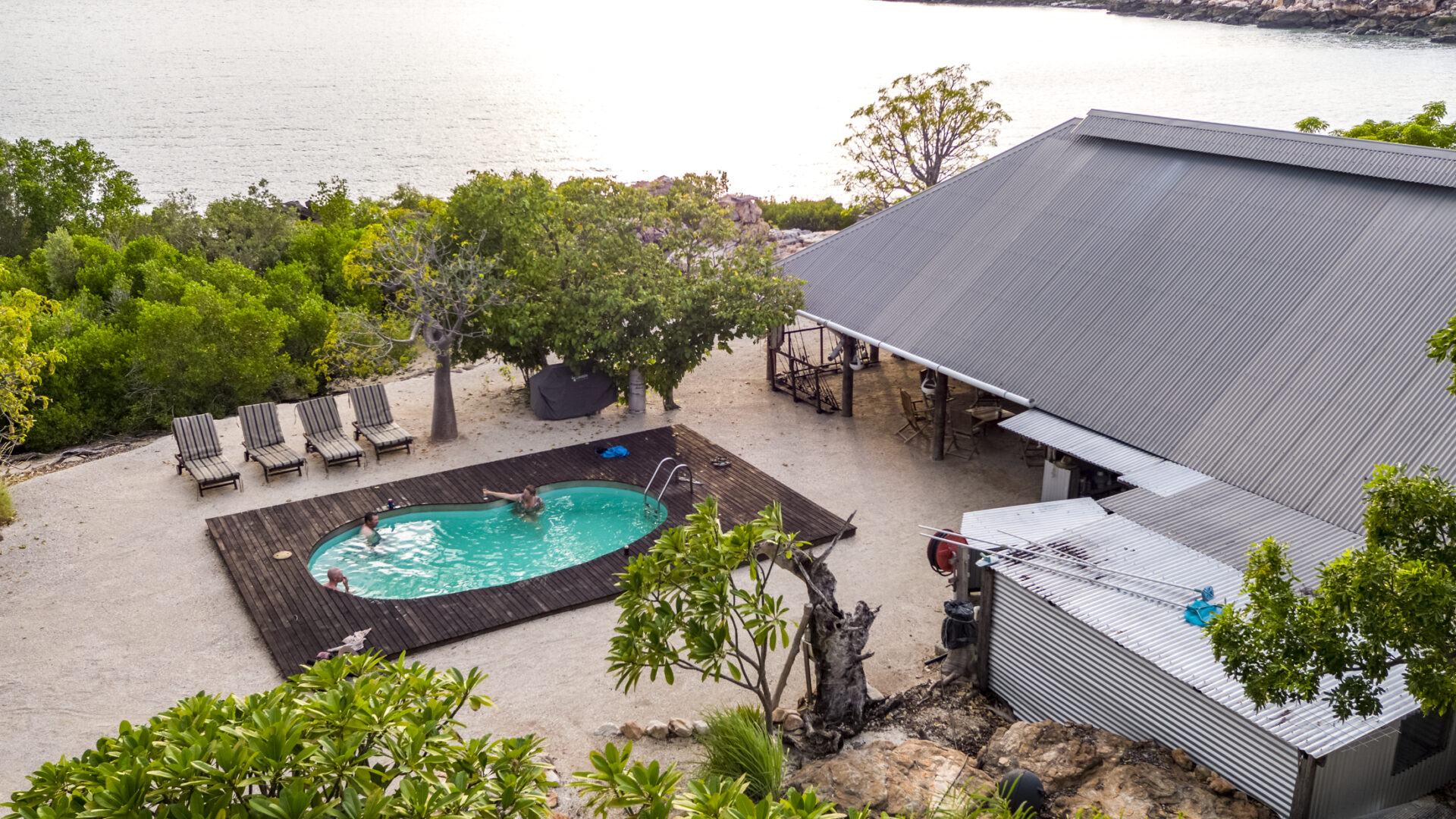 8 spacious beachfront bungalows with king-size or twin single beds, screened walls, handmade timber furniture, reading lamps, ceiling fans, and private ensuite bathrooms constructed from bush timbers. The main camp (“The Shed”) is an open-sided pavilion with recycled timber, high raked ceilings, a rustic dining table, library, music system, and swimming pool overlooking the Admiralty Gulf.